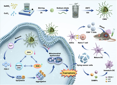 针对当前铜死亡肿瘤治疗效率低、肿瘤免疫微环境抑制等难以有效调控的关键科学问题,团队开发了一种具有超小带隙(1.71eV)的钨酸铜(CuWO4,CWO)纳米颗粒。CWO在超声刺激下表现出较强的压电催化效应,快速产生大量活性氧(ROS)并实现了Cu2+离子的可控释放,诱导细胞“铜死亡”。同时,CWO纳米颗粒还能有效原位消耗肿瘤组织中过量谷胱甘肽(GSH)和烟酰胺腺嘌呤二核苷酸磷酸(NADPH),实现细胞“铁死亡”。通过“氧化应激-铁死亡-铜死亡”多重级联反应放大肿瘤细胞损伤,增强抗肿瘤效应,并显著诱导线粒体膜电位崩解,促使损伤相关分子(DAMPs)释放,引发强烈免疫原性细胞死亡(ICD)效应,有效激活机体的抗肿瘤免疫应答。