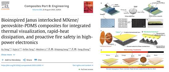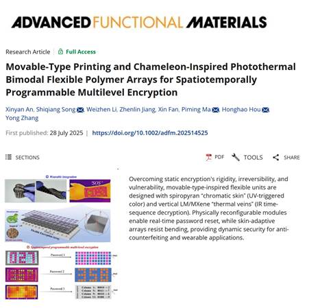 近日,yl23455永利宋仕强副教授指导硕士研究生安新妍、杨旭分别在学术期刊《Advanced Functional Materials》(中科院一区Top,影响因子19)、《Composites Part B: Engineering》(中科院一区Top,影响因子14.2)上发表了题为“Movable-type Printing and Chameleon-Inspired PhotothermalBimodal Flexible Polymer Arrays for Spatiotemporally Programmable MultilevelEncryption”和“Bioinspired Janus Interlocked MXene/Perovskite-PDMSComposites for Integrated Thermal Visualization, Rapid-heat Dissipation, andProactive Fire Safety in High-Power Electronics”的研究论文。
