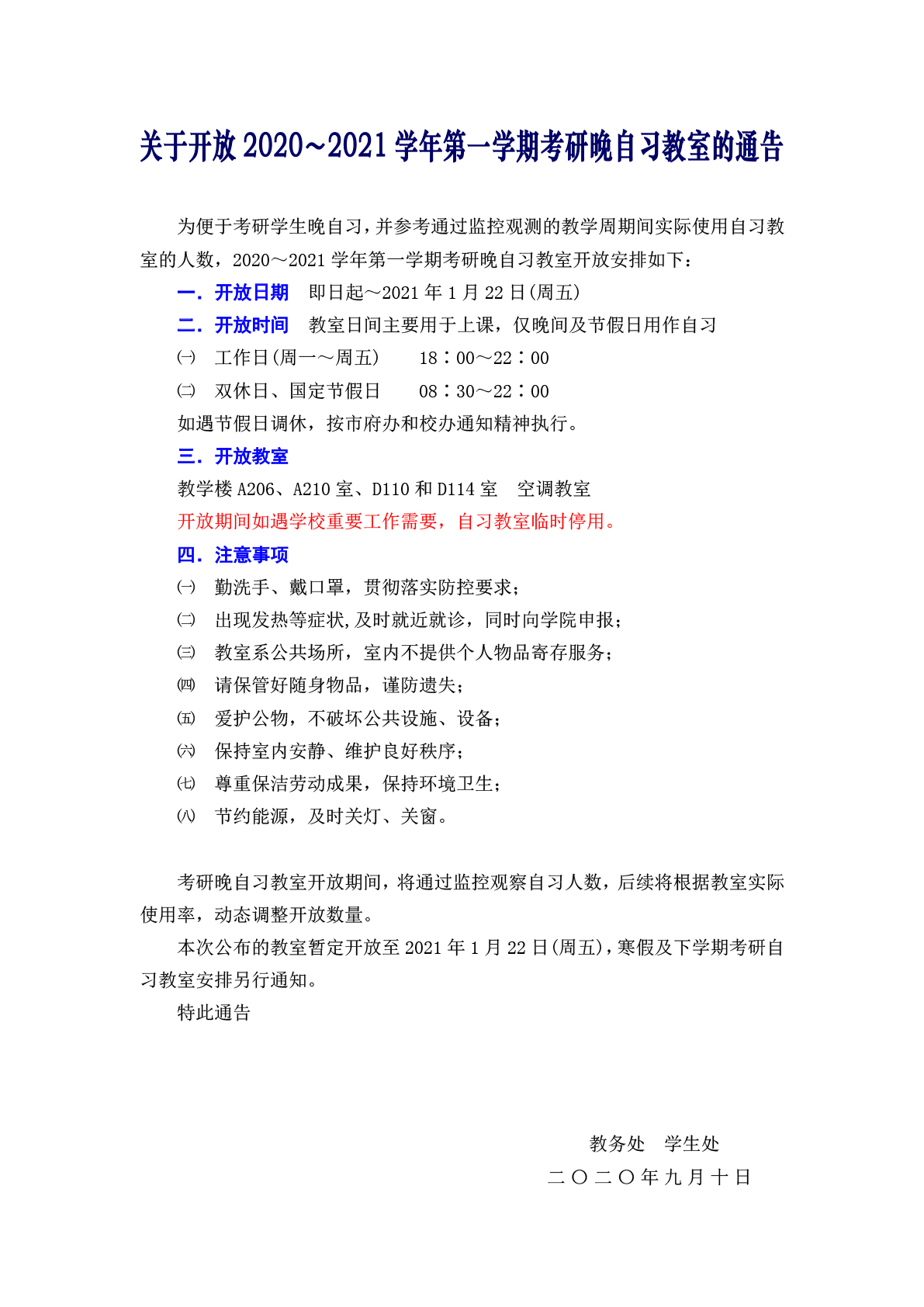 关于开放2020~2021学年第一学期考研晚自习教室的通告