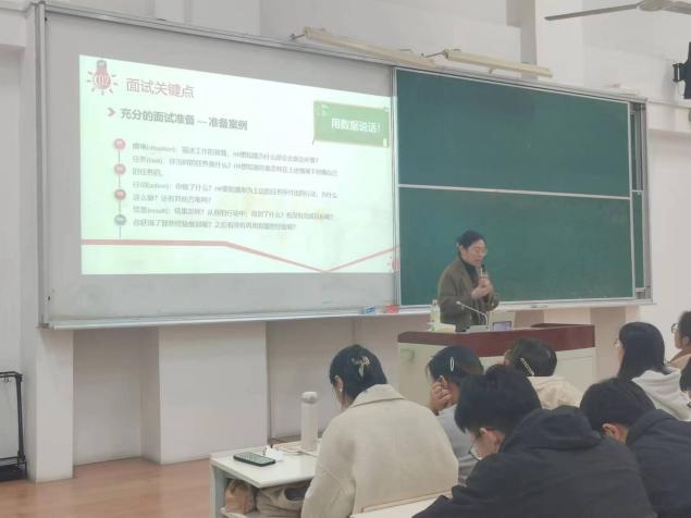 首先,朱经理向大家介绍了企业招聘流程,并强调了在求职前学会自我剖析的重要性。她建议大家可以先从性格测试和价值观分析等方面来明确自身的求职意向,以避免短期间内频繁入职又离岗的情况。其次,朱经理向大家详细讲述了面试考察纬度及面试如何准备。她强调,在面试前同学们要对公司及应聘职位有充分的了解,还要做好自我介绍的准备,并练习面试常见问题的应答方式。