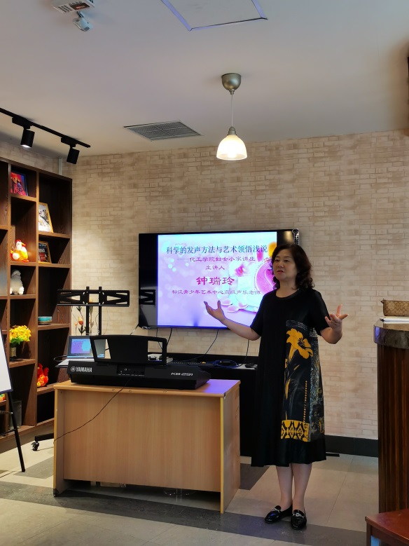 化工妇女小家有幸请到了松江青少年活动中心的高级声乐老师----钟瑞玲老师。钟老师在松江文艺界的名字几乎无人不晓,1997年5月,她成功举办了松江历史上第一个独唱音乐会,她的演唱还曾多次在上海市的声乐比赛中获奖。