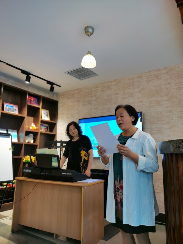 钟老师边讲边示范,通俗易懂的教我们发声的方法和技巧。第一,提上嘴唇,放松下嘴唇,脸部的苹果肌提起来,就可以更有利的张嘴唱歌。第二,象打哈欠一样发声,气体通道可以打开,把气通到丹田,这样再高的音也能发出来。第三,咬字一定要清楚,前鼻音和后鼻音要分的清楚。随着钟老师幽默、生动的引领,平时唱的《我和我的祖国》忽然唱出了不一样的感觉,唱出了专业的水平。钟老师特别敬业,她边讲边唱,不知不觉时间过得飞快,我们完整地学完了《我和我的祖国》这首歌。几个勇敢的同事上台进行了表演,唱的有板有眼,收获很大。