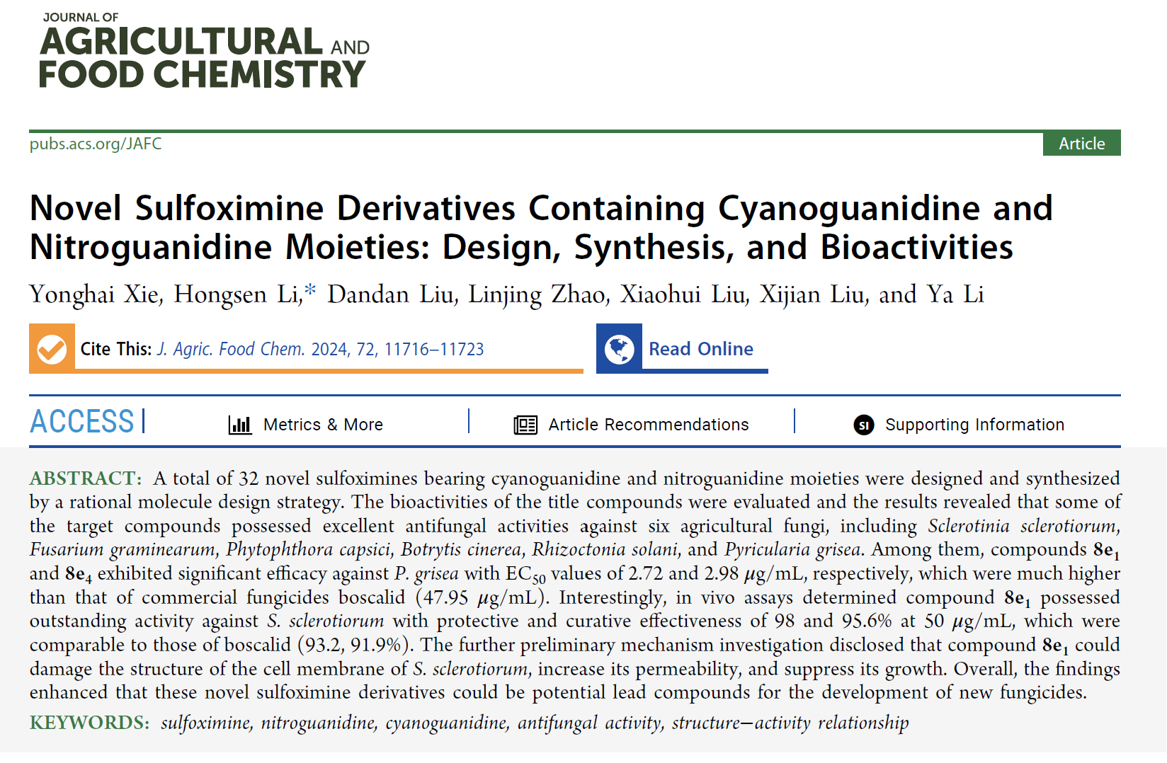 近日,yl23455永利李洪森副教授指导研究生解永海在农业化学领域一区TOP期刊《Journal of Agricultural and Food Chemistry》(影响因子5.7), 发表题为 “Novel Sulfoximine Derivatives Containing Cyanoguanidine and Nitroguanidine Moieties: Design, Synthesis, and Bioactivities” 最新研究成果。
