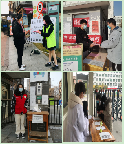 曾参与进博会志愿者的金怡彤同学返乡后积极报名“盛京义勇”志愿者并成为一员,担任了所在社区24个楼栋的上门排查工作;入党积极分子张硕寒假返乡后严格遵守家乡疫情防控七天居家隔离政策,隔离期满后马上报名参加了社区执勤卡点志愿者,和居委会工作人员一起认真排查登记过往车辆、人员,助力社区疫情防控;热心公益事业的邵心怡同学积极参与到了社区珠溪志愿服务队,担任社区文明劝导、疫情防控宣传、居民信息核实工作任务;周旸同学返乡后得知地方疾病预防控制中心招募防疫志愿者的信息后,第一时间主动报名,承担了对进入医院人员进行体温测量、查看健康码、基本信息登记、提供咨询服务等工作任务。