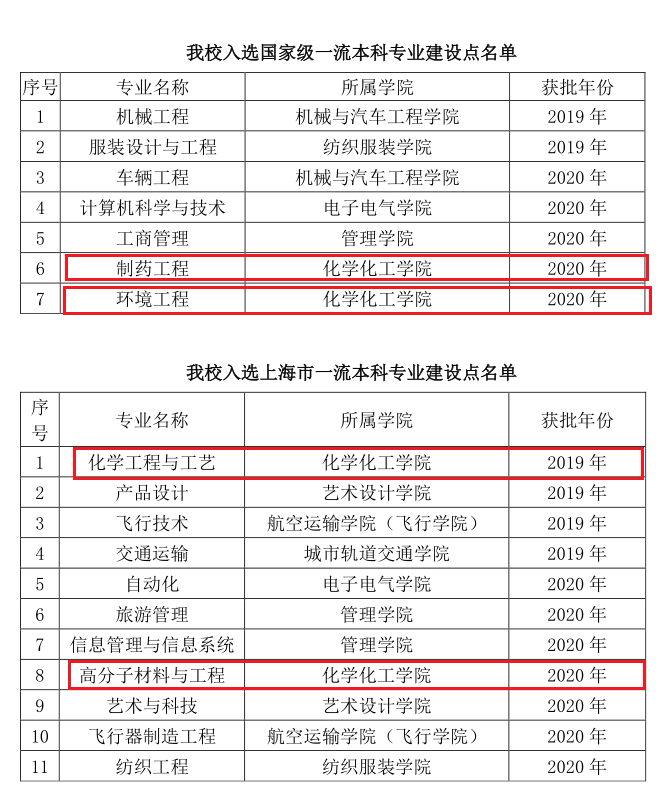 近日教育部印发《教育部办公厅关于公布2020年度国家级和省级一流本科专业建设点名单的通知》(教高厅函﹝2021﹞7号),公司车辆工程、计算机科学与技术、工商管理、制药工程、环境工程5个专业入选国家级一流本科专业建设点,自动化、旅游管理、信息管理与信息系统、高分子材料与工程、艺术与科技、飞行器制造工程、纺织工程7个专业入选上海市一流本科专业建设点。