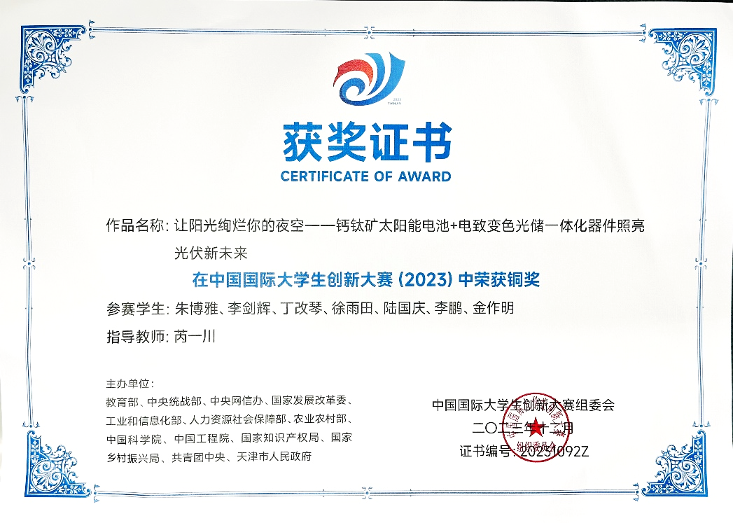 近日,教育部正式颁发中国国际老员工创新大赛(2023)(原中国国际“互联网+”老员工创新创业大赛)奖项,yl23455永利芮一川老师指导的朱博雅、李剑辉、丁改琴、徐雨田、陆国庆、李鹏、金作明团队项目《让阳光绚烂你的夜空——钙钛矿太阳能电池+电致变色光储一体化器件照亮光伏新未来》荣获国赛铜奖,这是公司参赛团队在本届赛事取得的最好成绩,也是公司在高教主赛道上的唯一获奖团队。