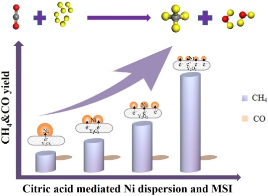 由于CO2和H2分子较高的活化能垒,研究具有高反应活性和稳定性的催化剂成为当前研究的热点。课题组利用柠檬酸络合的催化剂制备策略,制备了具有高CO2转化率、高CH4选择性和稳定性良好的Ni/Y2O3 催化剂,深入揭示了催化剂中界面结构电子转移效应和金属-载体强相互作用与反应活性的内在关系。此项研究成果发表于催化领域国际TOP期刊《Applied Catalysis B:Environmental》(系中科院SCI分区2020年12月最新升级版化学大类一区Top期刊,IF=19.503),题为“Remarkably efficient and stable Ni/Y2O3 catalysts for CO2 methanation: Effect of citric acid addition”(https://doi.org/10.1016/j.apcatb.2021.120206, 第一作者:李莺莺,通讯作者:门勇教授)。