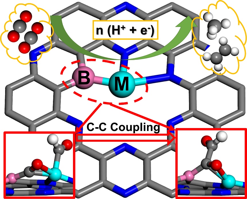 电催化二氧化碳还原反应(CO2RR)可在温和环境条件下,将重要温室气体之一的CO2直接转化为高附加值燃料和化学品,当使用可再生电力驱动反应时,可成为实现可持续化学和能源未来的一种可行解决方案,对助力达成我国“3060双碳目标”有重要现实意义。二维碳基材料用于CO2RR的实验和理论研究是当前的国际热点,其中就包括著名的单原子催化剂(SAC),而作为SAC的一个增强平台,双原子催化剂(DAC)因其双原子活性位点的多功能调节和协同效应而备受关注,通常研究的是金属(M)-金属(M)双原子位点,很少研究金属-非金属组合位点,甚至此类活性位点是否真正具备电催化活性也未可知。为此,通过对有实验依据的M@X-C2N(M=Fe、Co、Ni和Cu;X=S、P和B)上CO2RR的密度泛函理论系统计算研究,证实了杂化M–B双原子活性位点在驱动CO2RR特别是C–C耦合方面的功能优于单或双M中心;其中,Fe@BC2N(μ=2 μB)在C-C耦合中的自由能垒最低(0.17 eV),而Ni@BC2N(μ=0 μB)主要产生CH4,最低势垒为0.42 eV。因此,M的电子自旋态在调节CO2RR中的选择性和C–C耦合势垒方面颇为重要。同时,文章预测了Fe@BC2N为CO2RR主要生成C2+产物有前途的催化剂,部分原因即是其增强的自旋电子态,上述新发现无疑丰富了在环境条件下运行的电催化剂的设计策略。