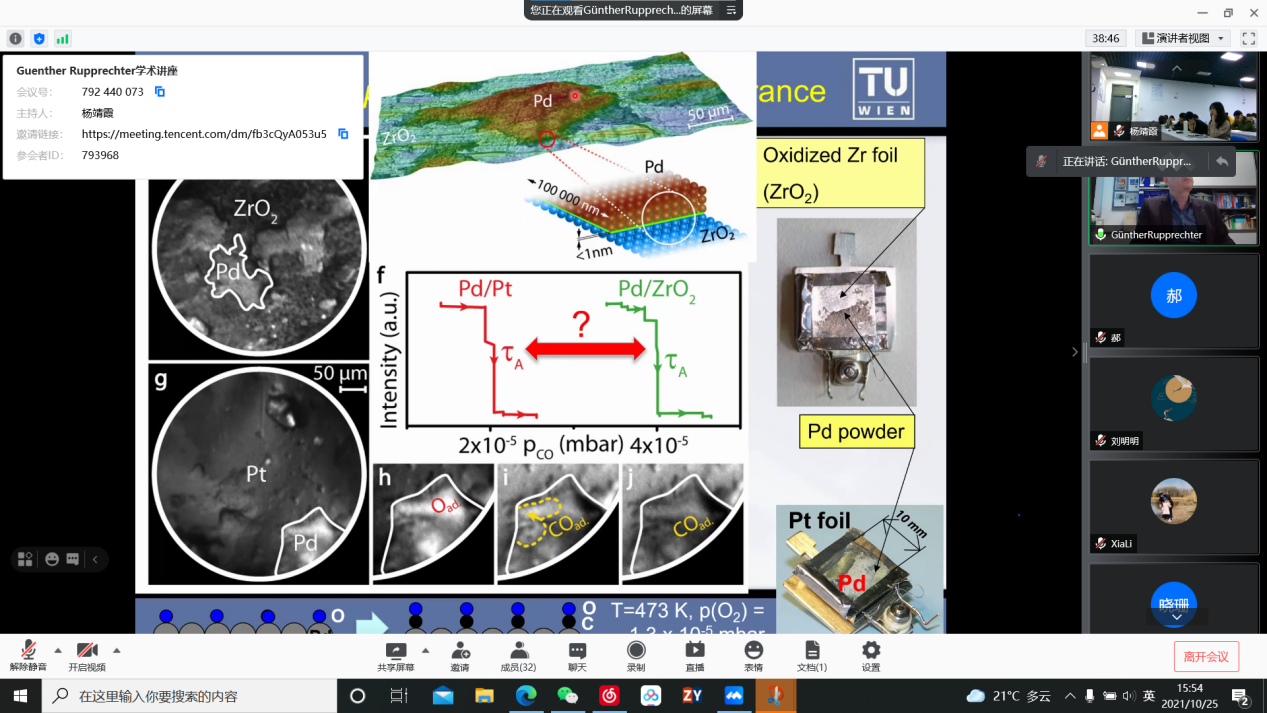 2021年10月25日下午,世界著名多相催化专家,奥地利科公司院士Günther Rupprechter作为海外名师应邀,通过腾讯会议(会议号:792 440 073)为公司研究催化反应领域的全体师生作了《Watching ongoing reactions by single particle catalysis》的专题讲座。