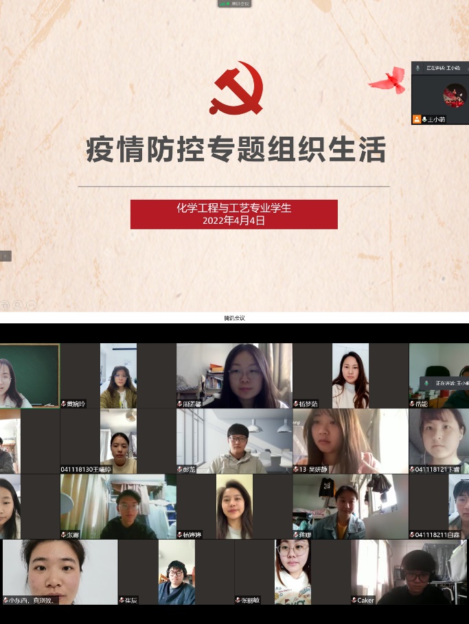 2022年4月4日,根据上级的有关要求,化学工程与工艺专业员工党支部线上开展了疫情防控专题组织生活。首先,党支部书记王小萌同志向党支部全体党员传达了上级有关工作要求,并进行了宣传部署。其次,全体党员认真学习了“近期疫情防控工作精神”的文件并在会上加以讨论,表明了自己的决心与态度。坚定信心,充分发挥党员示范带动作用;主动靠前,严格落实疫情防控工作。最后,王小萌同志指出,所有党支部成员,不管是在公司党员还是校外党员,都要带头做到不信谣、不传谣,对不实言论要及时辟谣,力所能及地参加所在区域志愿活动,团结一心,共克时艰。