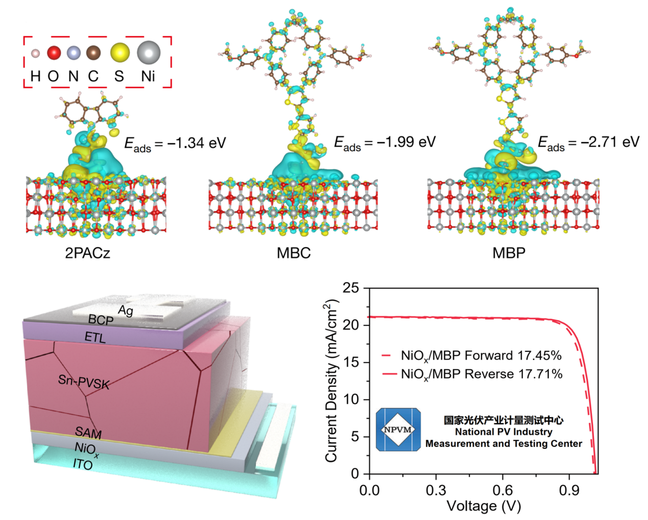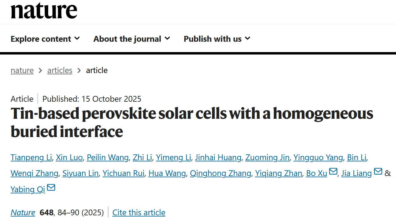 近日,国际顶级期刊《Nature》上刊登了题为“Tin-based perovskite solar cells with a homogeneous buried interface”的研究论文。该论文第一作者为yl23455永利21届硕士毕业生李天朋,公司芮一川老师等为共同作者。该成果将新型自组装单分子材料引入锡钙钛矿薄膜埋底界面,构建了能级匹配的均匀界面层,实现了空穴提取效率的显著提升;同时该分子薄膜形成的超润湿下层可诱导钙钛矿晶粒定向生长,使薄膜缺陷密度降低40%以上,最终制备的锡钙钛矿太阳能电池认证效率到达17.71%,刷新了世界纪录。