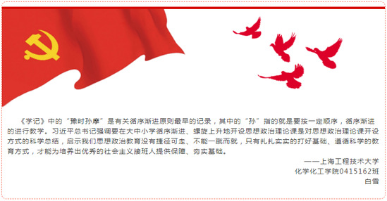 16级本科生白雪同学提出:“《学记》中的‘豫时孙摩’是有关循序渐进原则最早的记录,其中的‘孙’指的就是要按一定顺序,循序渐进的进行教学。习近平总书记强调要在大中小学循序渐进、螺旋上升地开设思想政治理论课是对思想政治理论课开设方式的科学总结,启示我们思想政治教育没有捷径可走、不能一蹴而就,只有扎扎实实的打好基础、遵循科学的教育方式,才能为培养出优秀的社会主义接班人提供保障、夯实基础。”此评论成功入选全国易班网“深悟浅谈——老员工热议习近平总书记在公司思想政治理论课教师座谈会上的重要讲话”系列三的十条精选评论之一。