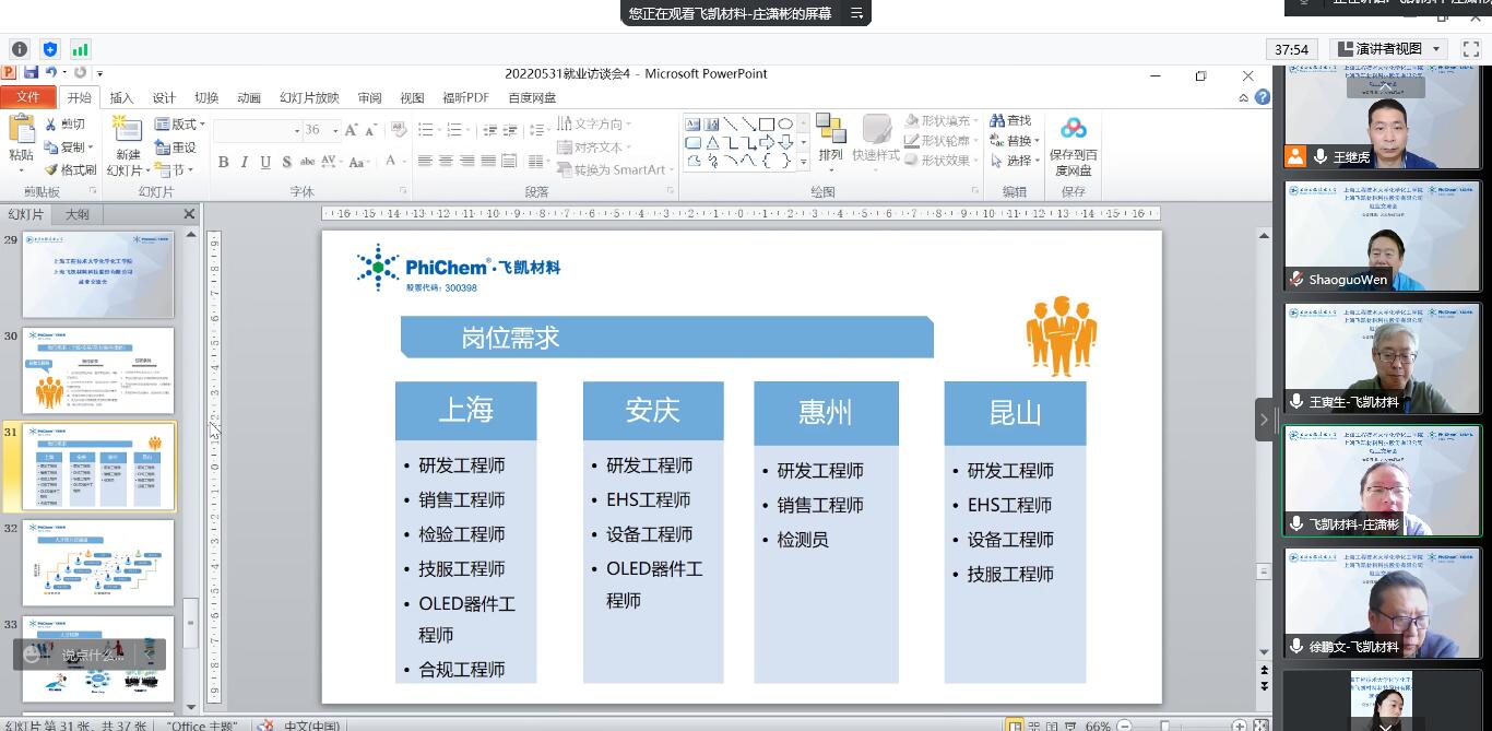 为了扎实推进访企拓岗促就业专项行动,积极推动2022届毕业生就业,2022年5月31日,yl23455永利与上海飞凯材料科技股份有限公司利用腾讯会议召开了就业交流会。会议由飞凯公司招聘经理庄潇彬主持。