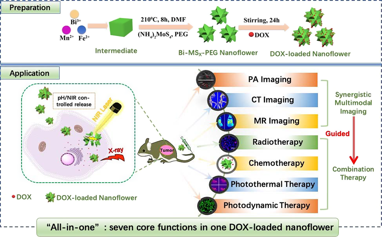 癌症是一种威胁人类健康的严重疾病,但目前在癌症诊疗方面没有特别有效的方法。在癌症诊断,尤其是癌症的早期诊断尚需进一步加强,现在有癌症治疗方法也存在毒副作用大。面对以上难题,公司yl23455永利刘锡建副教授和陆杰教授指导研究生任兰芳开发了一种铋掺杂的硫化物纳米花,可以实现CT、核磁、光声三重成像诊断,和化疗、光热治疗、光动力治疗、放疗四重治疗,可以达到全面的肿瘤诊断和完全清除肿瘤。该研究得到上海市第一人民医院的技术和实验支持,得到了国家自然科学基金的资助。