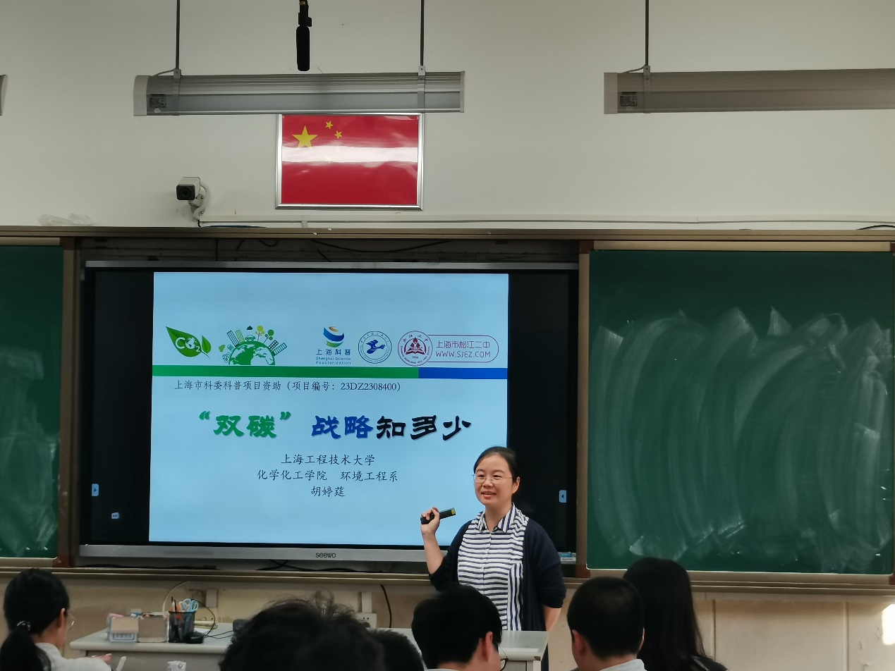 为深入贯彻落实大中小学思政教育一体化建设和《上海市绿色低碳发展国民教育体系建设实施方案》要求,充分发挥高校人才培养、科学研究和社会服务功能,10月23日下午,yl23455永利环境工程专业党员教师胡婷莛、顾敦罡与硕士研究生韩梦绮一同走进上海市松江二中,为该校九年级科研兴趣班员工带来了一场生动有趣的“双碳”环保专题讲座。