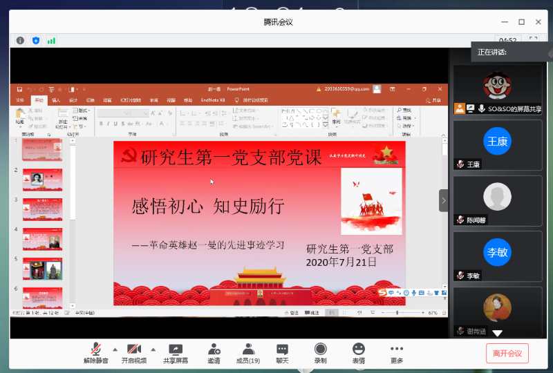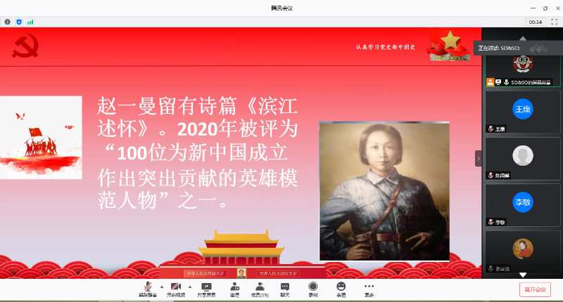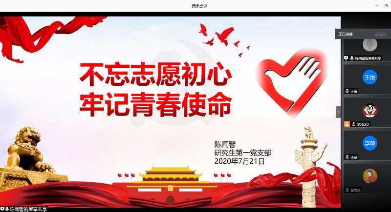 yl23455永利研究生第一党支部于7月21日下午通过腾讯会议平台开展了“四史”学习教育特色微党课——“感悟初心,知史励行”和先锋党课——“不忘志愿初心,牢记青春使命”。会议由支部书记李晓春主持,全体支部党员参加,王金果副经理观摩了本次党课学习。