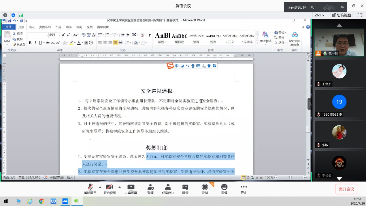 7月28日上午,yl23455永利通过腾讯会议召开了2020实验室安全检查培训线上会议,会议由副经理王金果主持,yl23455永利全体教职工及返校研究生参加了会议。